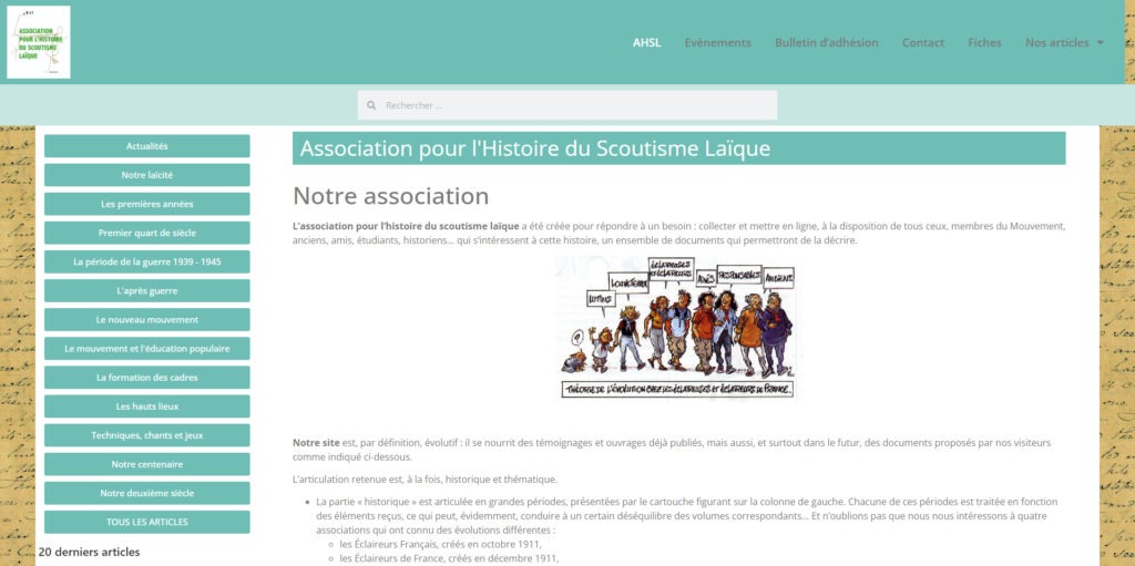L’association pour l’histoire du scoutisme laïque a été créée pour répondre à un besoin : collecter et mettre en ligne, à la disposition de tous ceux, membres du Mouvement, anciens, amis, étudiants, historiens… qui s’intéressent à cette histoire, un ensemble de documents qui permettront de la décrire. Quelques chiffres : Ce site est optimisé pour une […]